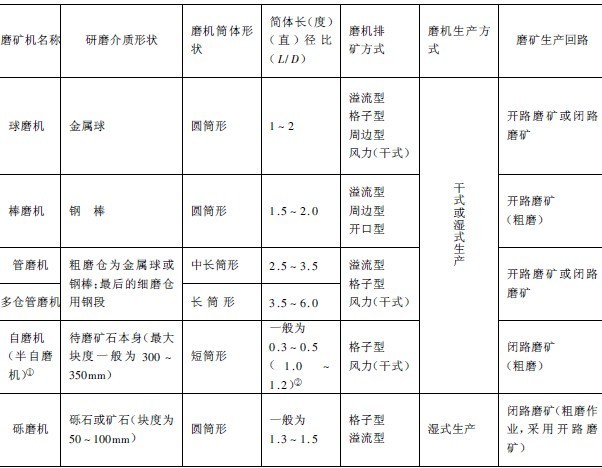 圓筒型磨機(簡稱磨機)規格以筒體內(直)徑和內長(度)尺寸表示。工業生產中廣泛應用的磨機種類很多,分類方法亦不相同,有的按照研磨介質的形狀分類,有的根據筒體形狀分類,有的按排礦方式分類,也有根據磨礦生產方式分類。