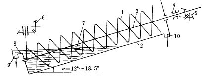 螺旋分級機的結構如圖3-4-15所示。分級槽2呈傾斜安置,傾角一般為12。~18.5。,槽的底部為半圓形。礦漿從槽的中間部位進料口7給入,在分級槽下端的分級帶完成分級。細粒級經槽子下端溢流堰8隨水流從溢流排出口9排走。粗粒級產物在分級帶沉降,然后由螺旋1將其運至槽子上端的沉砂排出口10排出機外。螺旋安裝在中空主軸3上,主軸兩端由軸承4支承,軸的上端設有傳動裝置5,軸的下端置于提升機構之內,必要時可調節螺旋在槽內的高度。
