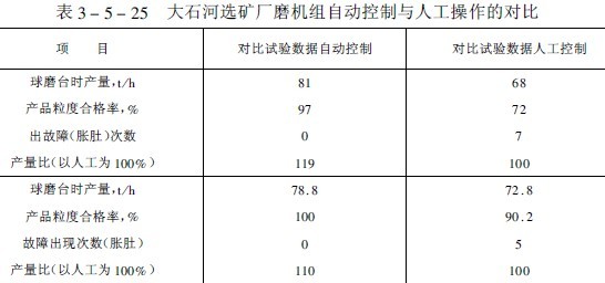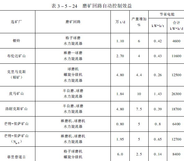 據(jù)國(guó)外報(bào)導(dǎo)磨礦回路自動(dòng)控制可提高產(chǎn)量2.5~10%處理一噸礦石可節(jié)省電能0.4~1.4千瓦·時(shí)(見(jiàn)表3-5-24)。