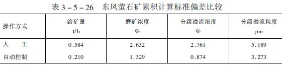 我國(guó)東風(fēng)螢石公司浮選廠和首鋼大石河選礦廠磨礦分級(jí)自動(dòng)控制經(jīng)驗(yàn)表明,采用自動(dòng)控制系統(tǒng)時(shí),磨礦操作的各項(xiàng)指標(biāo)的波動(dòng)范圍均比人工操作小(見(jiàn)表3-5-25和表3-5-26)。