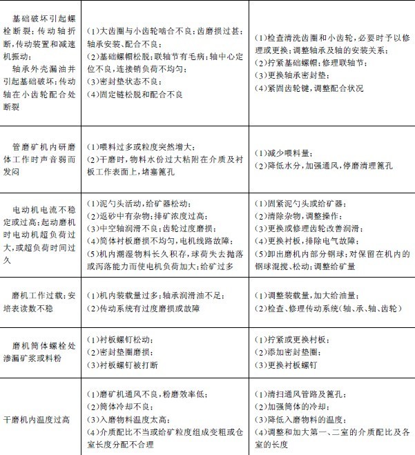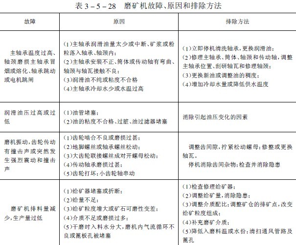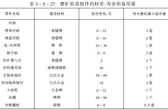 我國(guó)選礦廠生產(chǎn)實(shí)踐中球磨機(jī)易損件的材質(zhì)、使用壽命和設(shè)備用量列入表3-5-27中。常見(jiàn)故障、原因和排除方法見(jiàn)表3-5-28。
