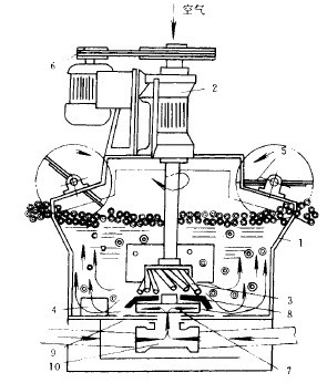 每個浮選槽均由槽體1、軸承體(連同中空主軸)2、斜棒葉輪3、穩流器4、刮板5、傳動裝置6及凸臺等組成。吸入槽中,除有上述部件(凸臺由壓蓋代替)之外,在其中空主軸的下端還有提升葉輪7、壓蓋8和底盤9(見圖1)。浮選槽只起浮選作用。吸入槽除起浮選作用外,還兼有吸漿能力,即把槽外的礦漿通過提升葉輪的作用并經導管10吸入槽內。穩流器是由幾十條垂直放置的曲率不同的圓弧板所組成。凸臺(及壓蓋)是用穩流器的圓弧形邊緣壓在槽體底部的。