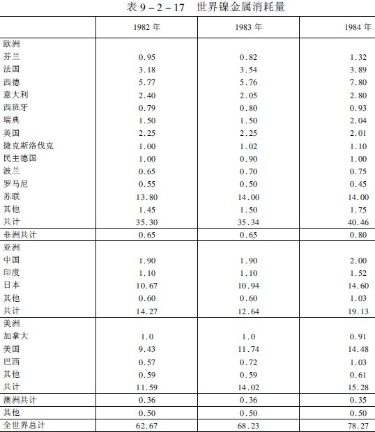 預計,今后全世界的鎳總消耗量將以年平均2%的速度增長,近年來,世界礦產鎳產量和鎳消耗量分別列于表9-2-16和表9-2-17。