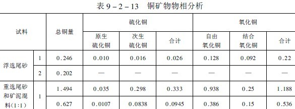 該礦含銅尾砂的特點是:除銅外伴生有稀有金屬,礦石呈酸性,但脈石碳酸鹽含量較高,粒度細(1毫米),呈粘性,滲濾性能差。尾砂的品位及銅礦物相組成列于表9-2-13。