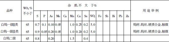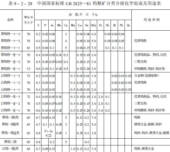 上述情況表明,冶煉對鎢精礦的質量要求是非常高的。但市面上并無統一標準,通常是冶煉廠根據自己所具備的工藝條件,來選購所需的鎢精礦。現將我國及世界有關國家所擬定的鎢精礦質量標準,分別列表于后。表9-2-28為我國鎢精礦質量標準,同時還規定可根據用戶需要和資源特點,自訂企業標準,這可使生產單位和使用單位在執行標準時有靈活性。